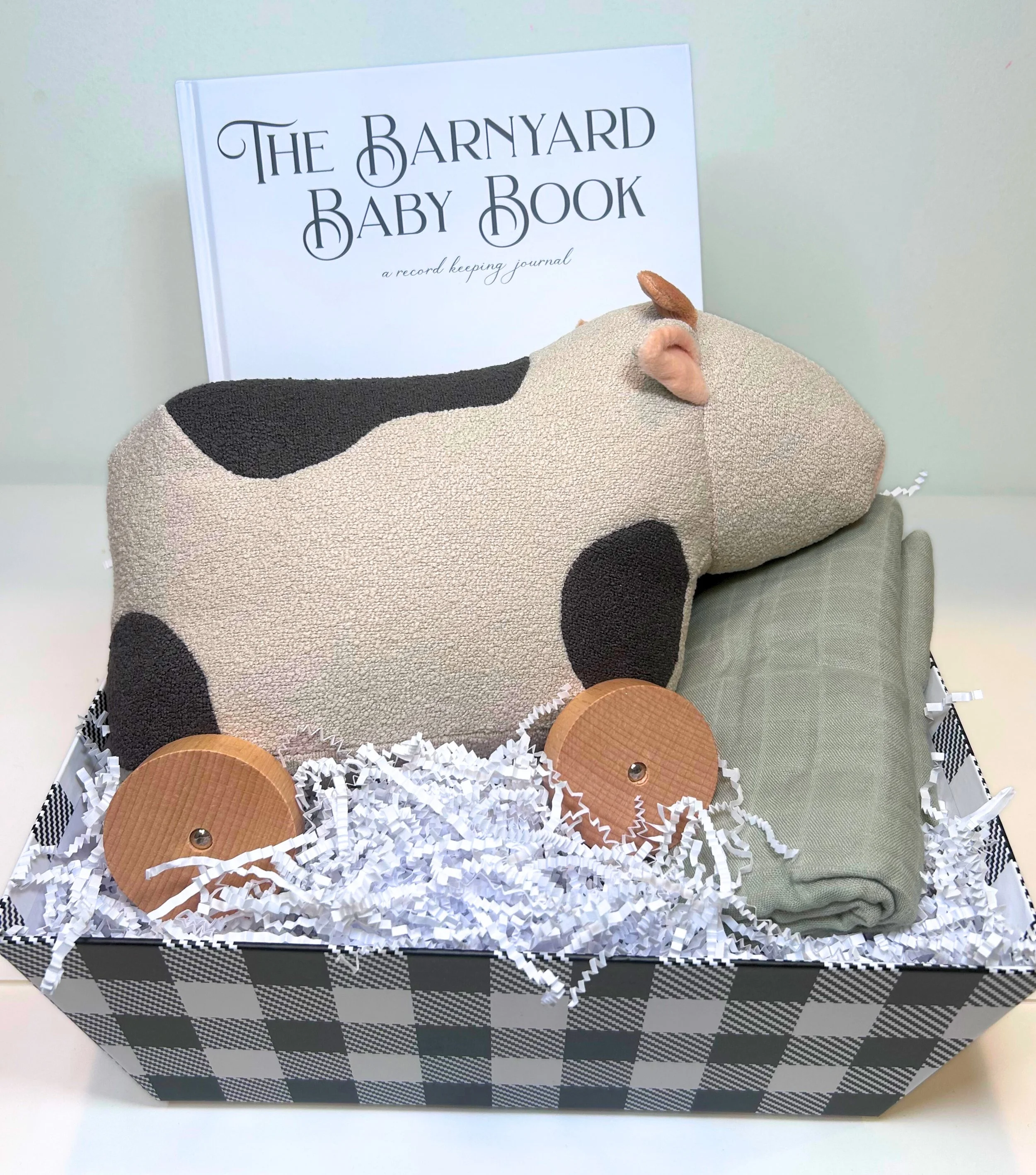 Celebrate a new arrival with a gift that’s equal parts adorable and practical. Perfect for clients or employees welcoming a little one, this box includes a keepsake baby book, a cozy muslin blanket, and the softest barnyard buddy on wheels. A charming way to say congratulations and support them in this new chapter.